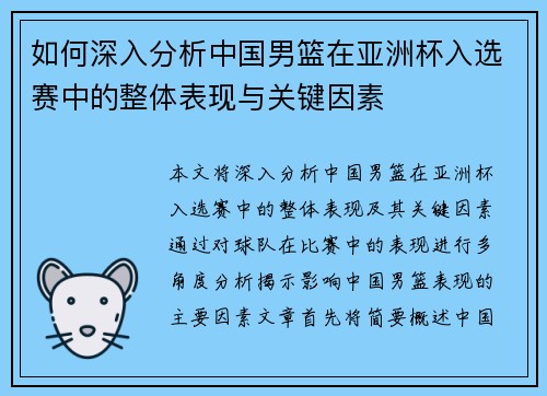 本文将深入分析中国男篮在亚洲杯入选赛中的整体表现及其关键因素。通过对球队在比赛中的表现进行多角度分析,揭示影响中国男篮表现的主要因素。文章首先将简要概述中国男篮在入选赛中的整体情况及成绩,再从球队战术布局、球员个人表现、对手的强弱对比、以及教练团队的作用四个方面,全面剖析中国男篮在此次比赛中的亮点与不足。最后,文章将对中国男篮如何在未来亚洲杯中提升表现给出一些建设性意见,并进行总结归纳。